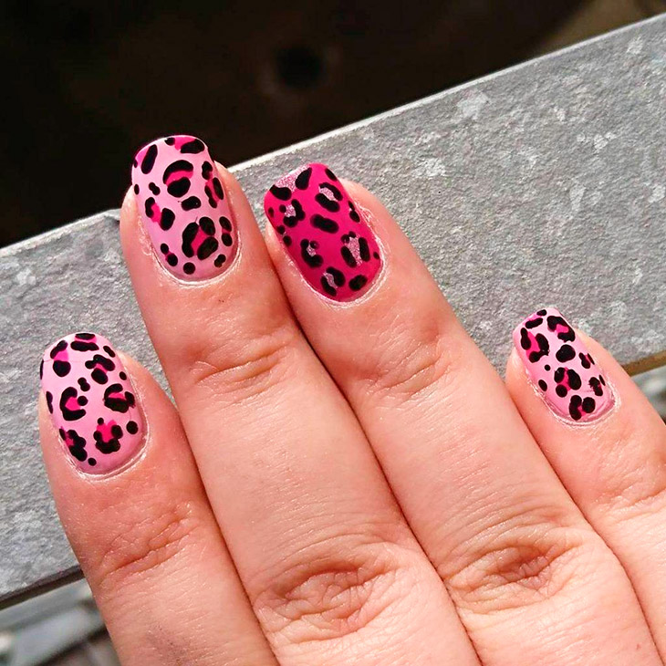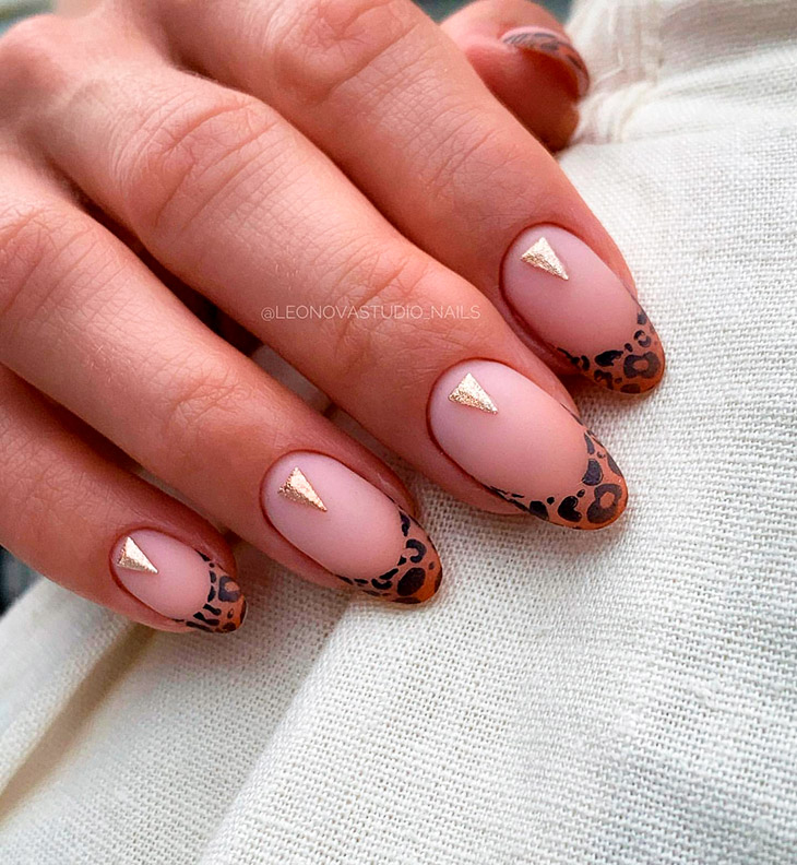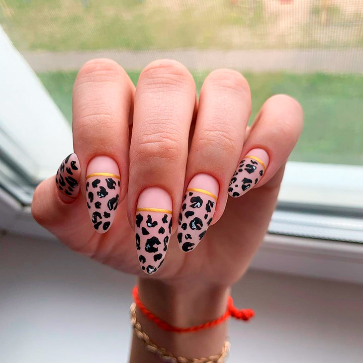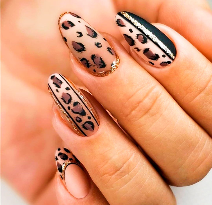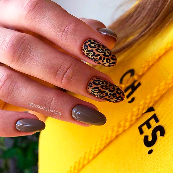 Несомненно, тигровый принт ушел из модной одежды, но пришел к овальным ногтям. Здесь ситуация неожиданная: не только оранжевый будет выгодно смотреться, но и акценты расставляют иначе. Так, мастера рекомендуют оставлять однотонным только один ноготь, а тигровые полоски рисовать на всех остальных.