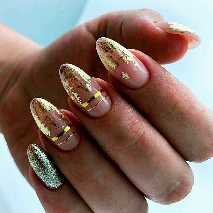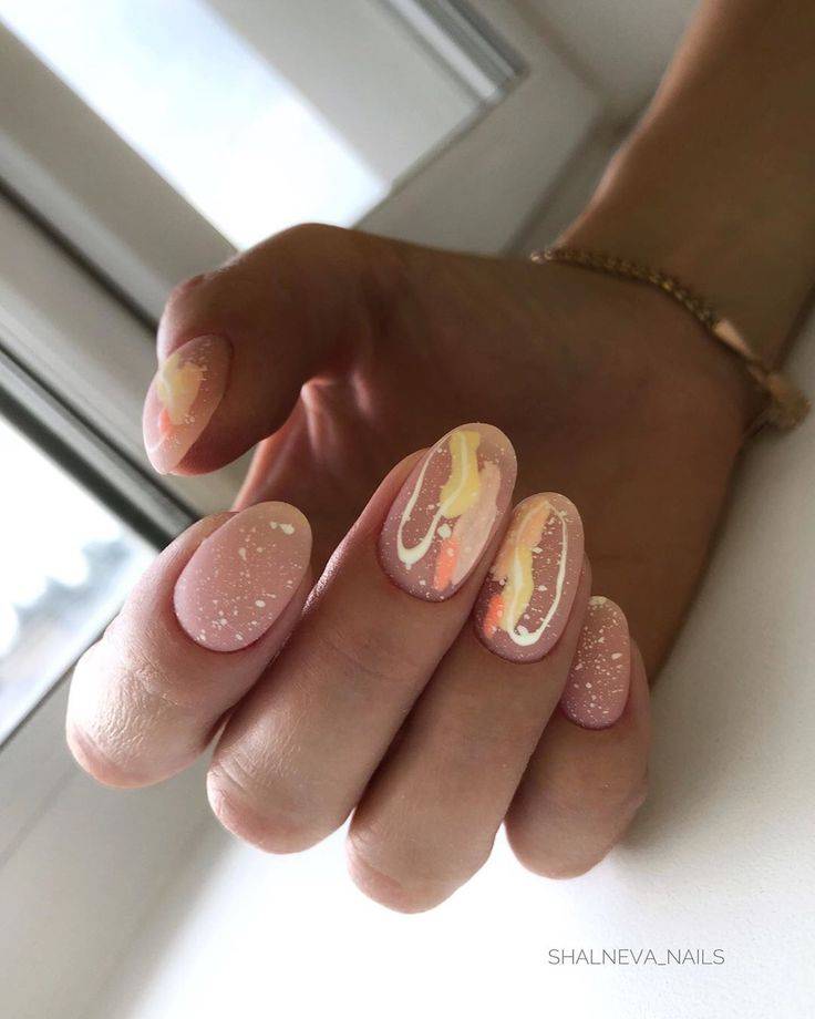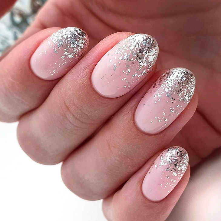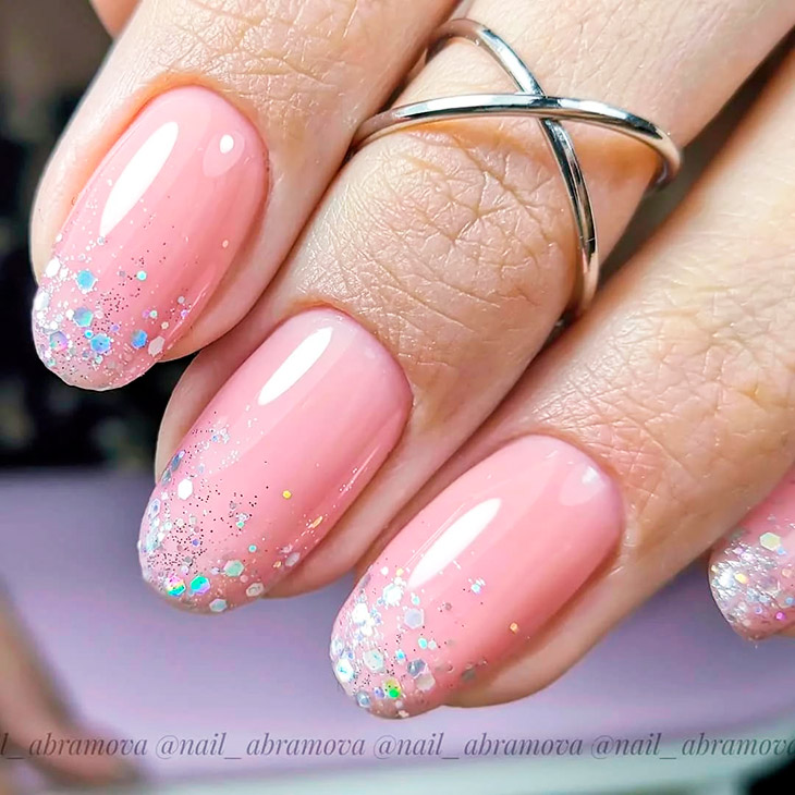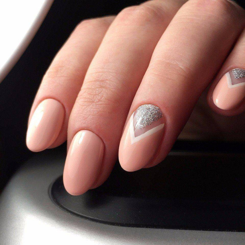 Обратите внимание на нюдовую гамму и блестки в одном маникюре. Такое оформление смотрится свежо и при этом остается нейтральным