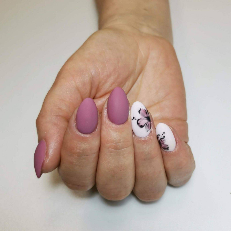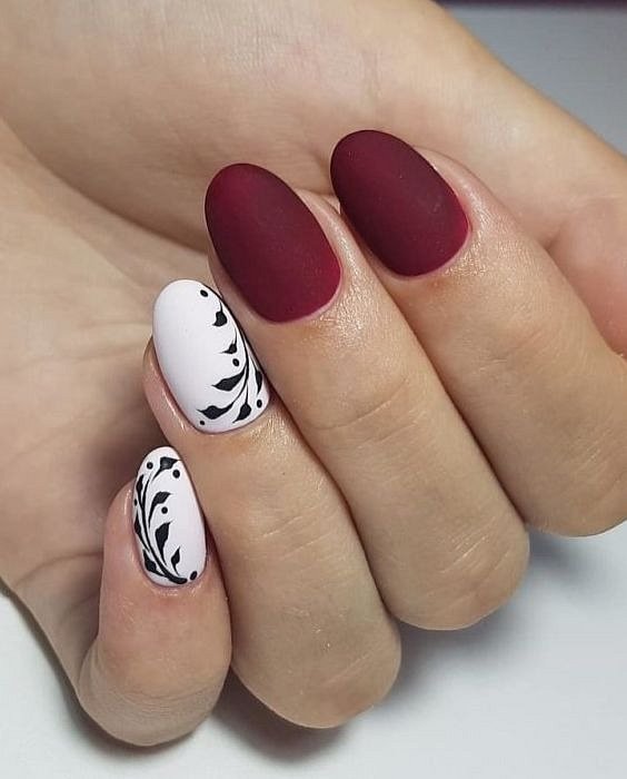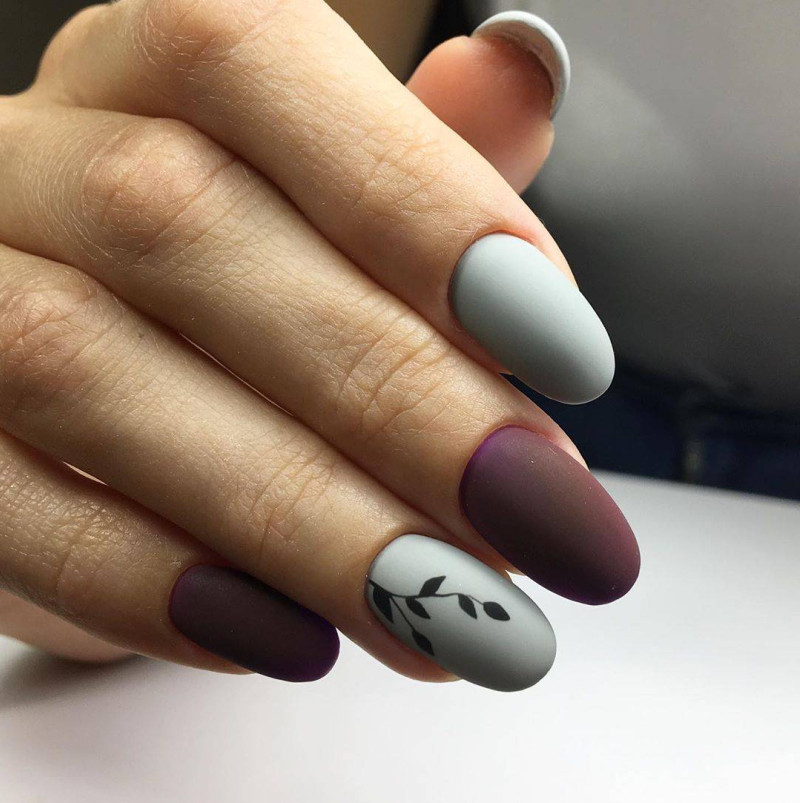 Можно сделать на ноготках овальной формы однотонный матовый маникюр. Также стоит попробовать матовый лунный или французский маникюр, омбре. Здесь какого-либо ограничения нет. Особо эффектно смотрятся на матовых ноготках глянцевые рисунки. Попробуйте простой однотонный глянцево-матовый френч. Будет очень красиво. Ещё можно нанести на матовый лак глянцевое кружево или завитки.