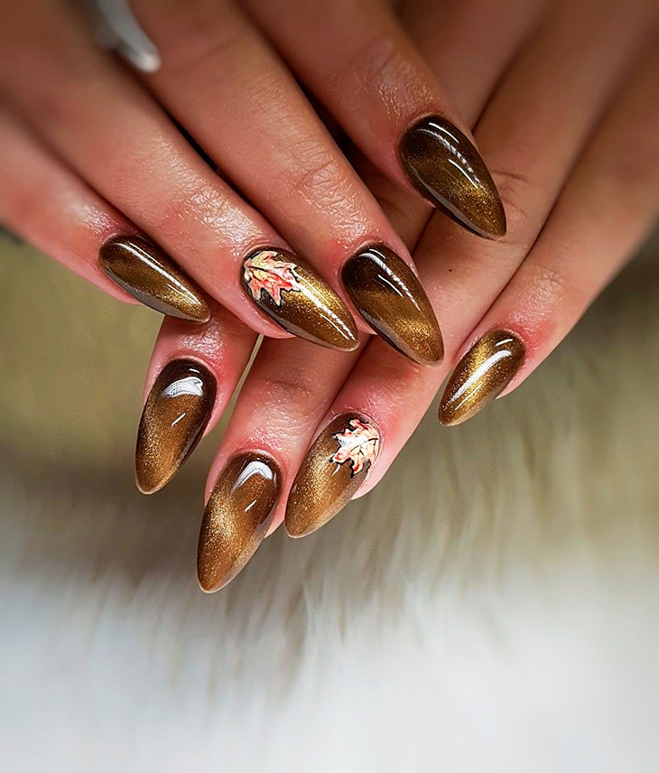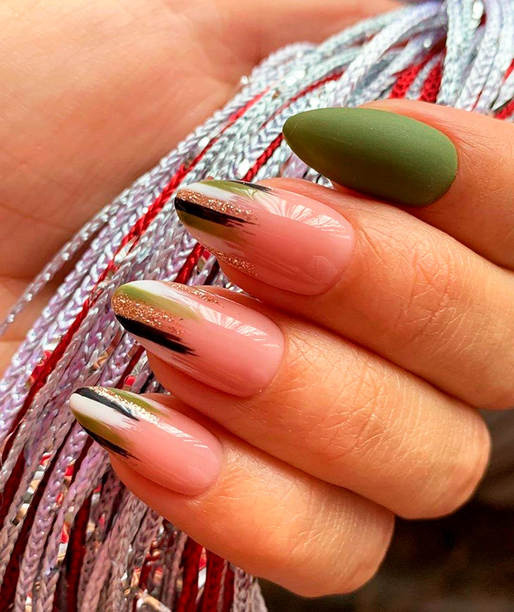 Хороший вариант для коротких овальных ногтей. Отлично будет выглядеть в тёмных оттенках. Здесь же можно обыграть приглушенный оранжевый, даже рыжий цвет, который не совсем подходит для такого дизайна в обычном применении.