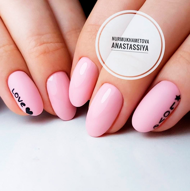 Овальный дизайн ногтей хорошо сочетается с надписями. Однако стоит учесть шрифт. Нежность овала подойдет для курсива, а вот жирные буквы только испортят впечатление.