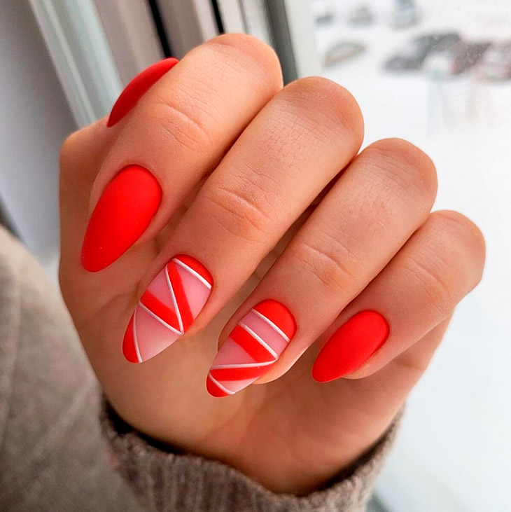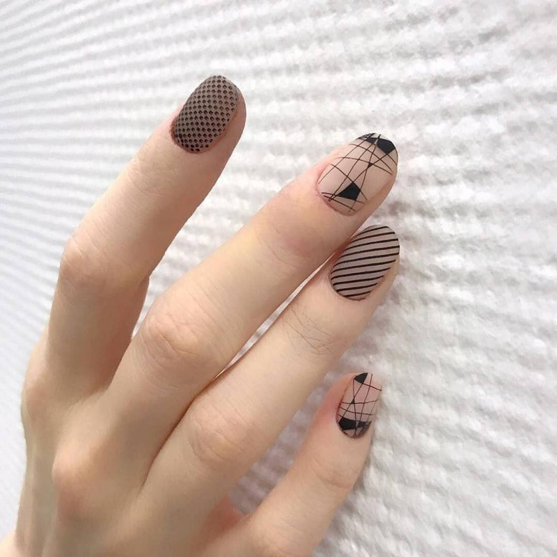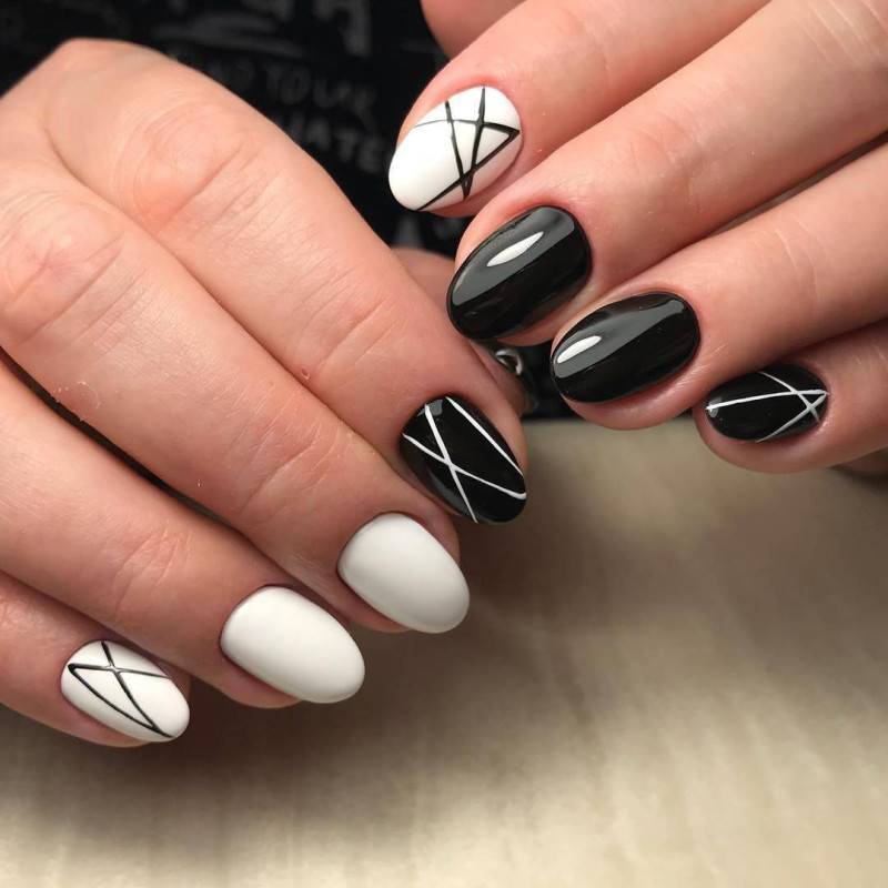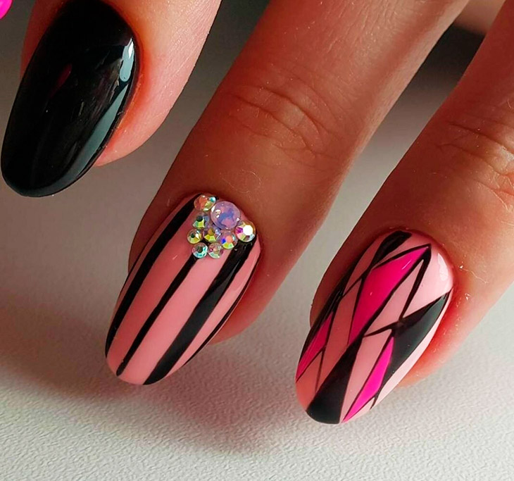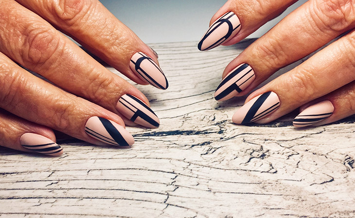 Полоски немного проигрышная ситуация для полноценного овального дизайна, но хорошо подойдут для сквоовала. Овал «съест» акцентную строгость, поэтому маникюр будет выглядеть слегка недоделанным.