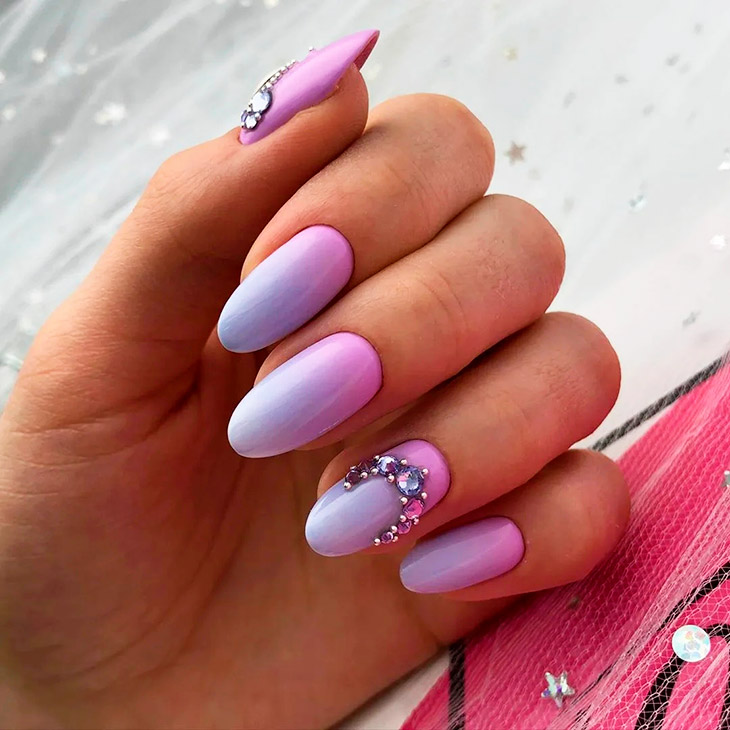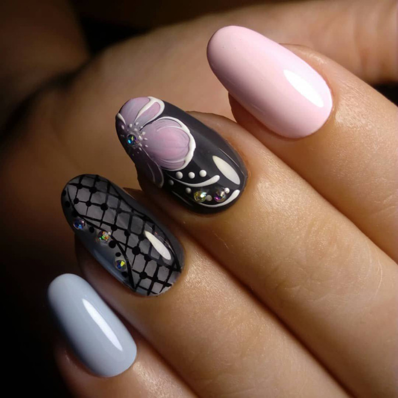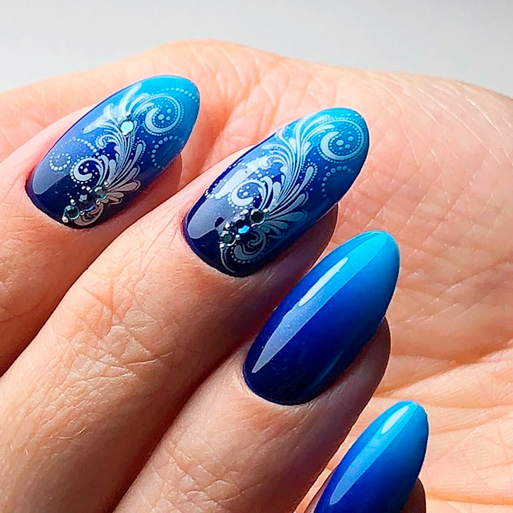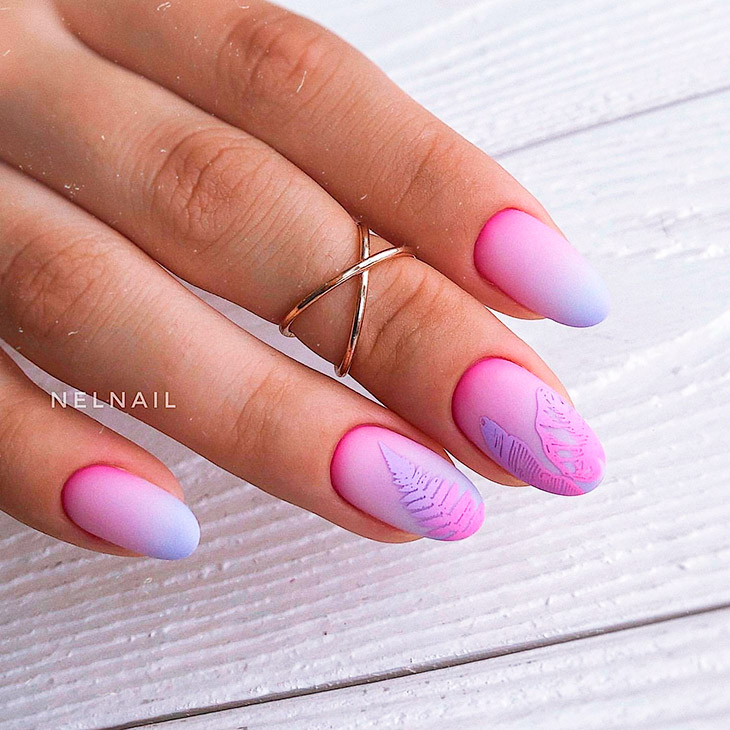 Градиент и омбре и остаются хорошим выбором для сдержанного овального маникюра с небольшой ноткой таинственности. Хорошо сочетается классические чёрно-белые, либо пастельные цвета, к примеру, от розового к голубому.