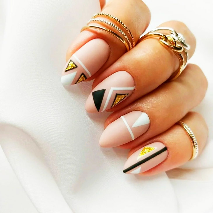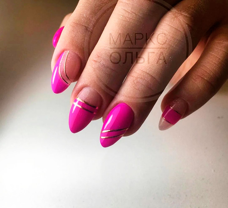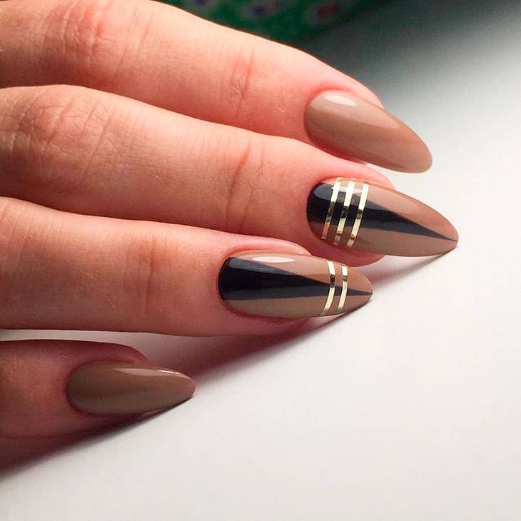 Данный вид дизайна используется едва ли не на любой форме ногтей. Все потому, что он универсальный, достаточно сдержанный и лаконичный. Благодаря этому его можно сочетать с любым оттенком лака и цветовым решением маникюра в целом. Точки, полосы, а также геометрические фигуры – все это выглядит невероятно красиво и современно.