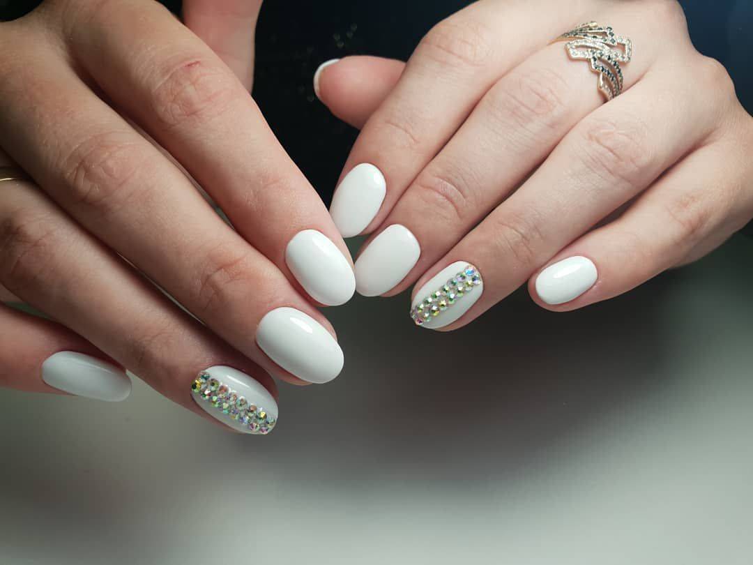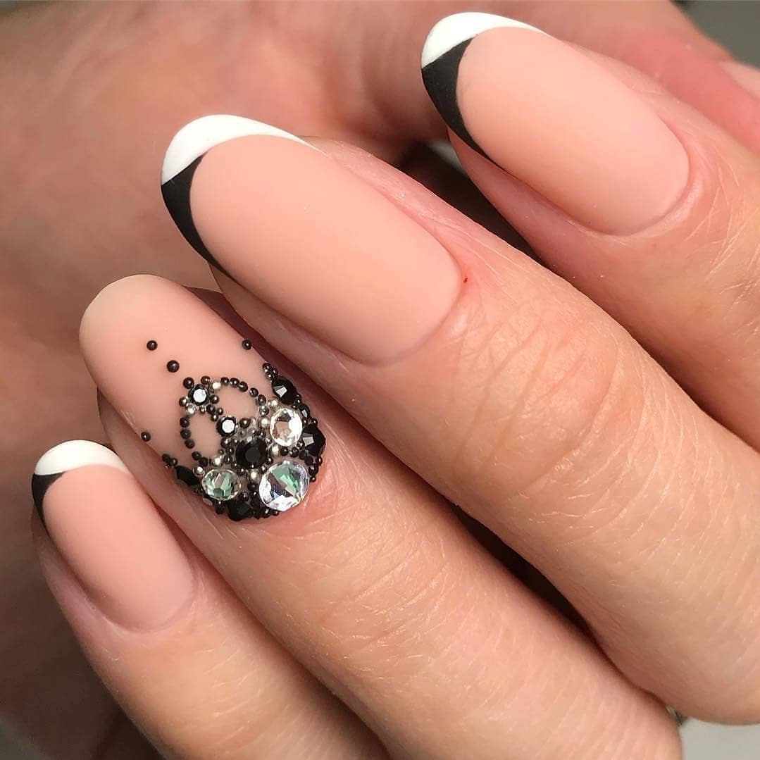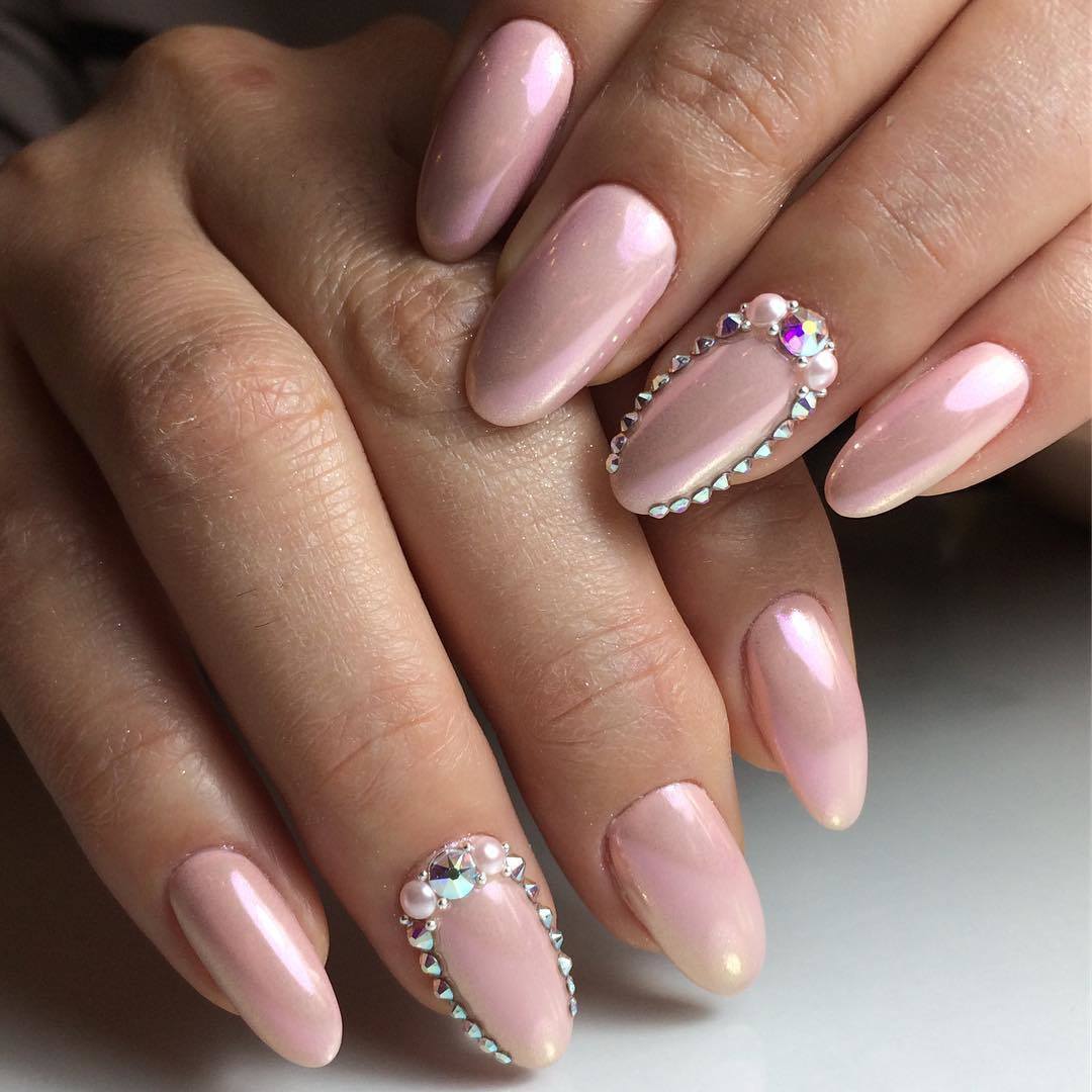 Стразы оживят любой дизайн, но и тут главное не «переступить» границы разумного. Лучше всего украсить овальные ногти около кутикулы.