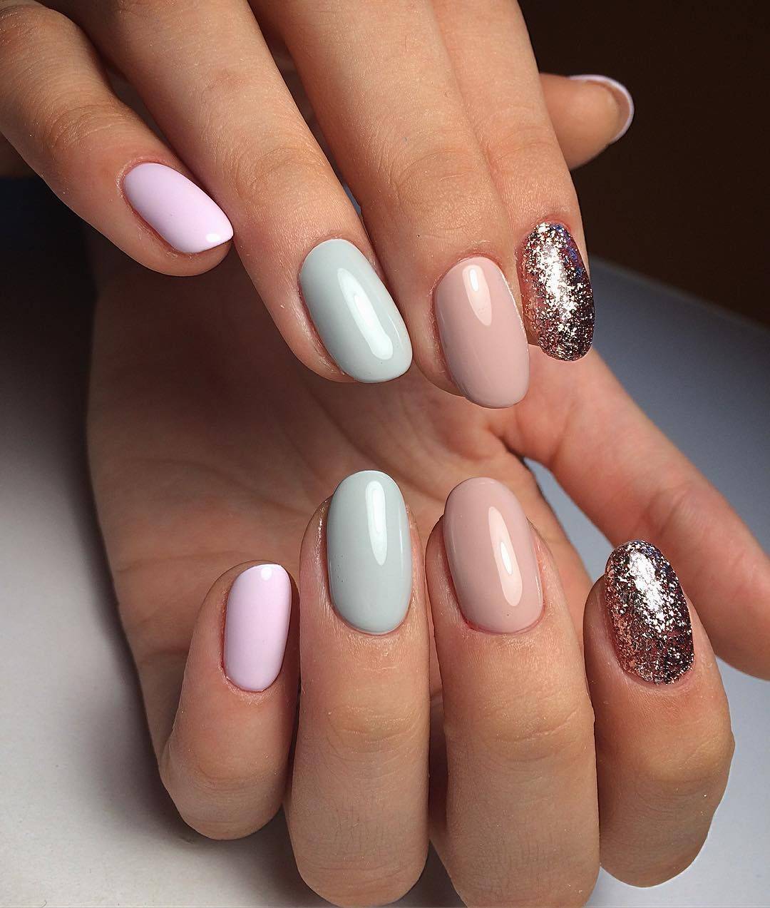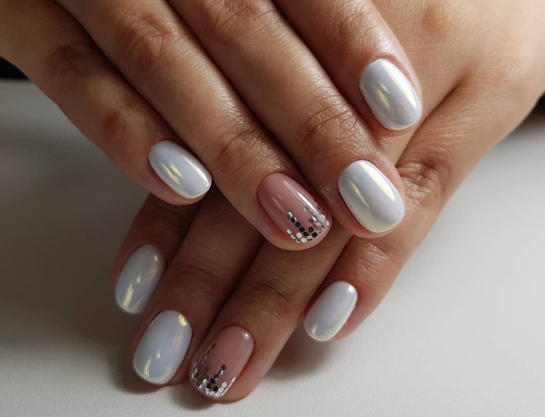 Обратите внимание на нюдовую гамму и блестки в одном маникюре. Такое оформление смотрится свежо и при этом остается нейтральным