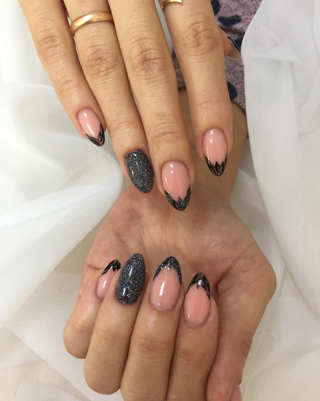 Также выбор можно сделать в пользу классического или микро френч-маникюра, например, черного, красного или бордового – такой дизайн всегда актуален. Французский стиль можно добавить минималистичными рисунками, выполненных самостоятельно или при помощи стемпинга. Также сочетание блесток и темного лака идеально подходит как для коротких ногтей, так и для длинных овальных ногтей. Когда длина позволяет, можно экспериментировать и оттенками лаков, и с модным дизайном.