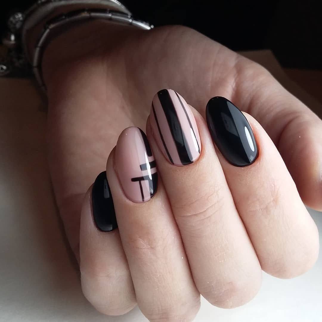 Полоски немного проигрышная ситуация для полноценного овального дизайна, но хорошо подойдут для сквоовала. Овал «съест» акцентную строгость, поэтому маникюр будет выглядеть слегка недоделанным.