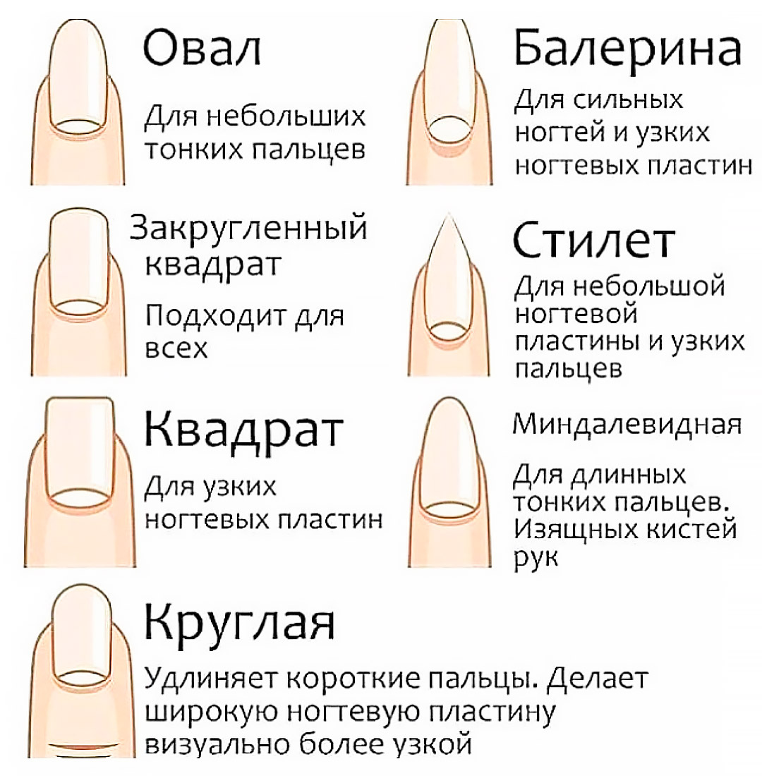 Гвозди бывают разных форм и размеров. Если вы посмотрите на узор ваших натуральных ногтей, вы, вероятно, обнаружите, что между пальцами у вас разные формы — один может стать квадратным, а другой — более округлым. Форма более округлая, овальная. По сути, он повторяет форму кончиков пальцев, но со сглаженными круглыми краями.
