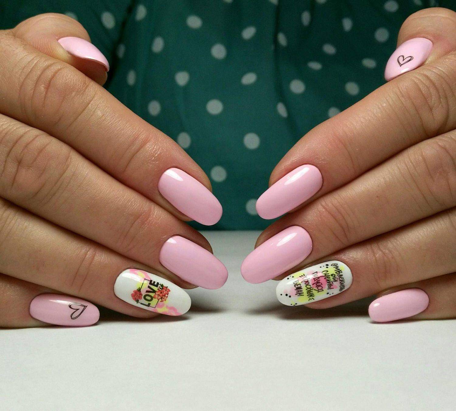 Овальный дизайн ногтей хорошо сочетается с надписями. Однако стоит учесть шрифт. Нежность овала подойдет для курсива, а вот жирные буквы только испортят впечатление.
