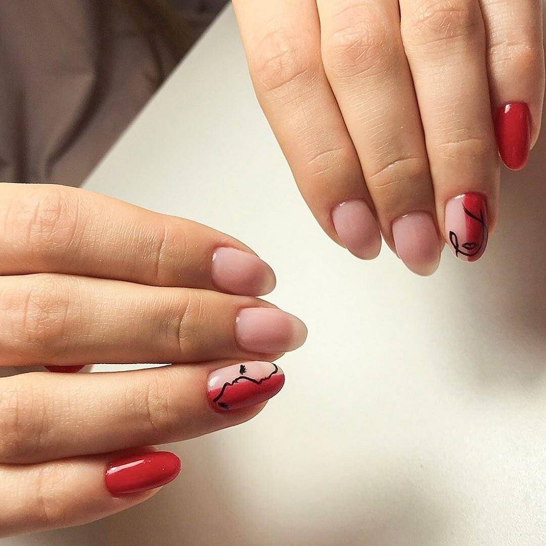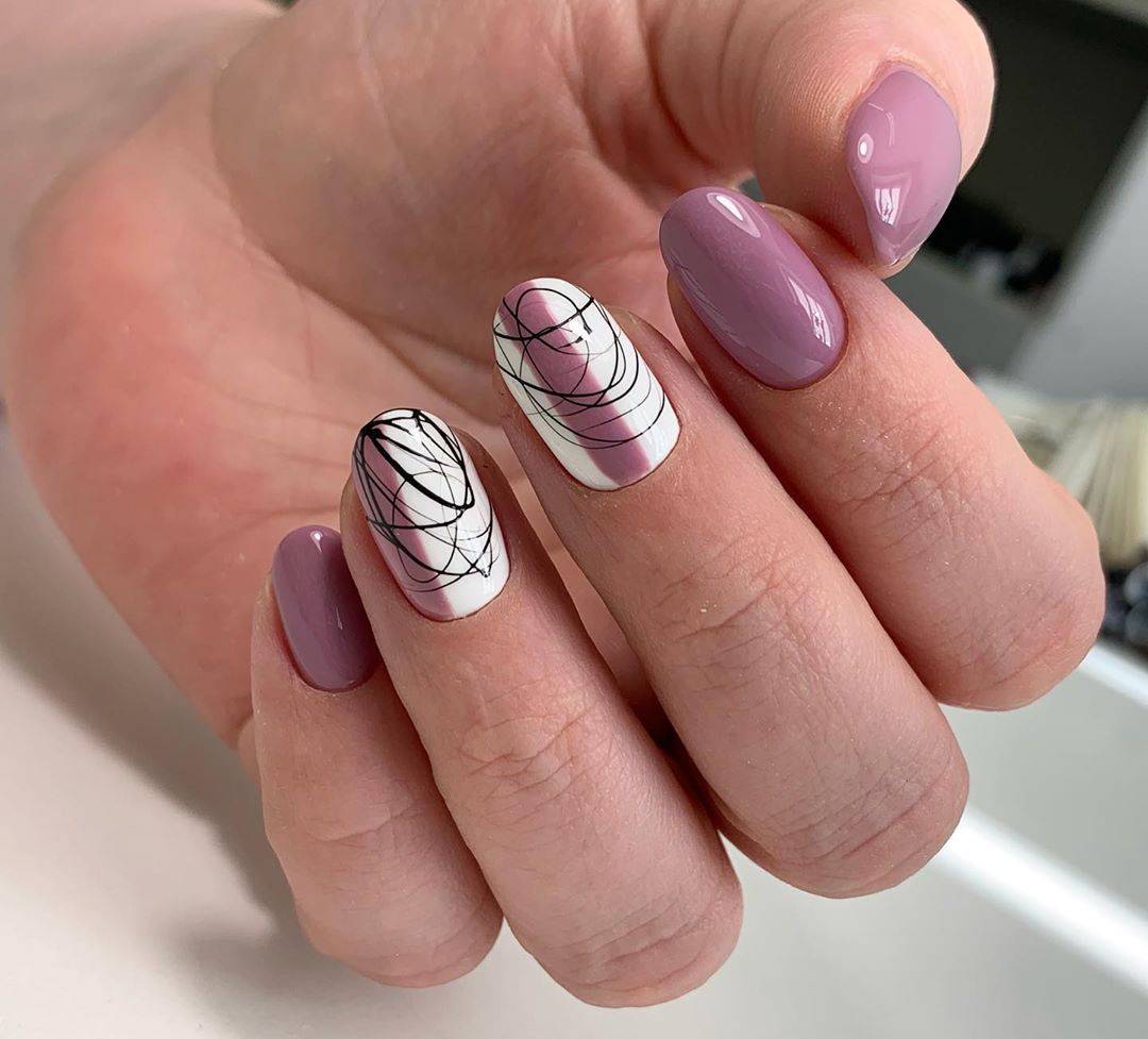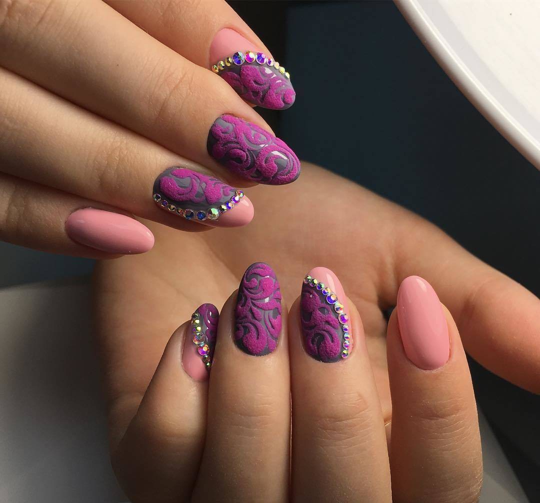Здесь так же важно не переборщить. Узорами с завитками можно украсить один ноготь, сделав на него акцент, а остальные оставить в однотонном варианте. Трендовые узоры на овальных ногтях могут быть абсолютно любыми — это всё зависит от желания самой женщины и умения мастера