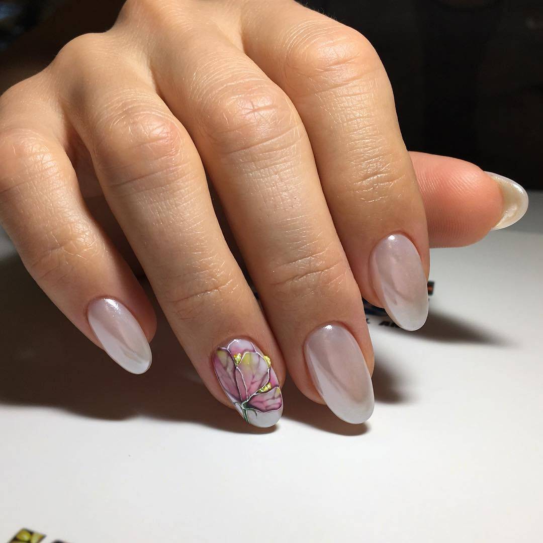 Овал можно назвать идеальным фоном для выполнения любого рисунка. Это может быть как примитивный принт, так и настоящий художественный шедевр. Цветы, нарисованные на таких ноготках, смотрятся невероятно нежно и натурально. Для тех, кто сомневается в своих художественных способностях, специально созданы тематические наклейки, трафареты и стемпы.