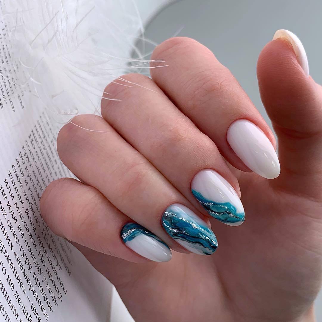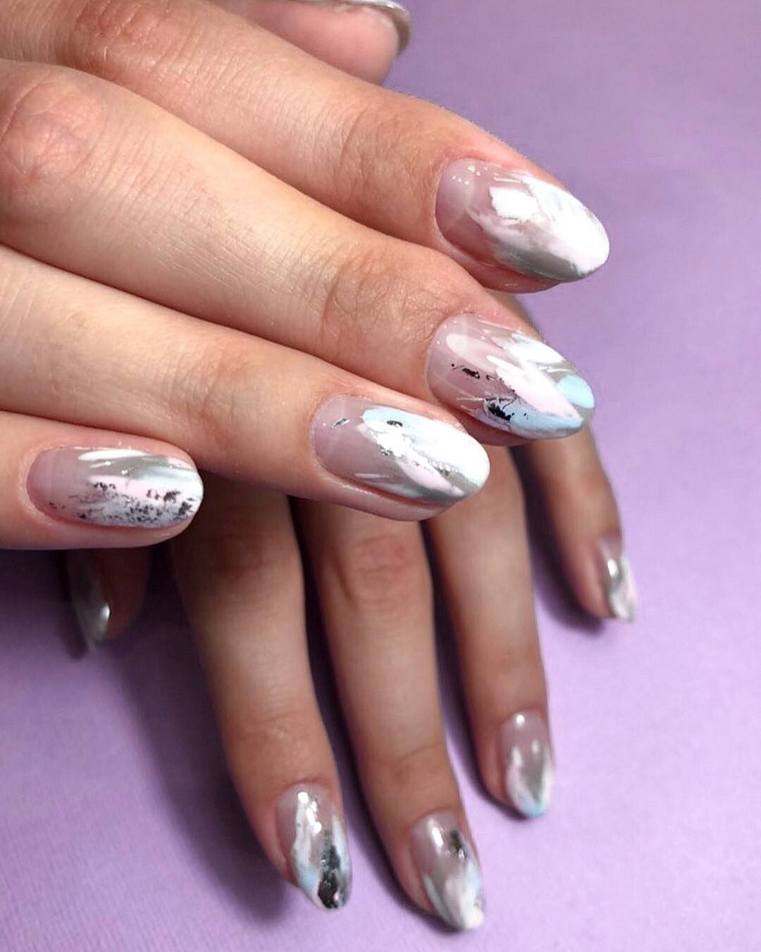 Трендовые узоры на овальных ногтях могут быть абсолютно любыми — это всё зависит от желания самой женщины и умения мастера. Однако стоит отметить, что «мраморность» давно ушла из трендов. Сейчас в моде «точки» и «брызги».