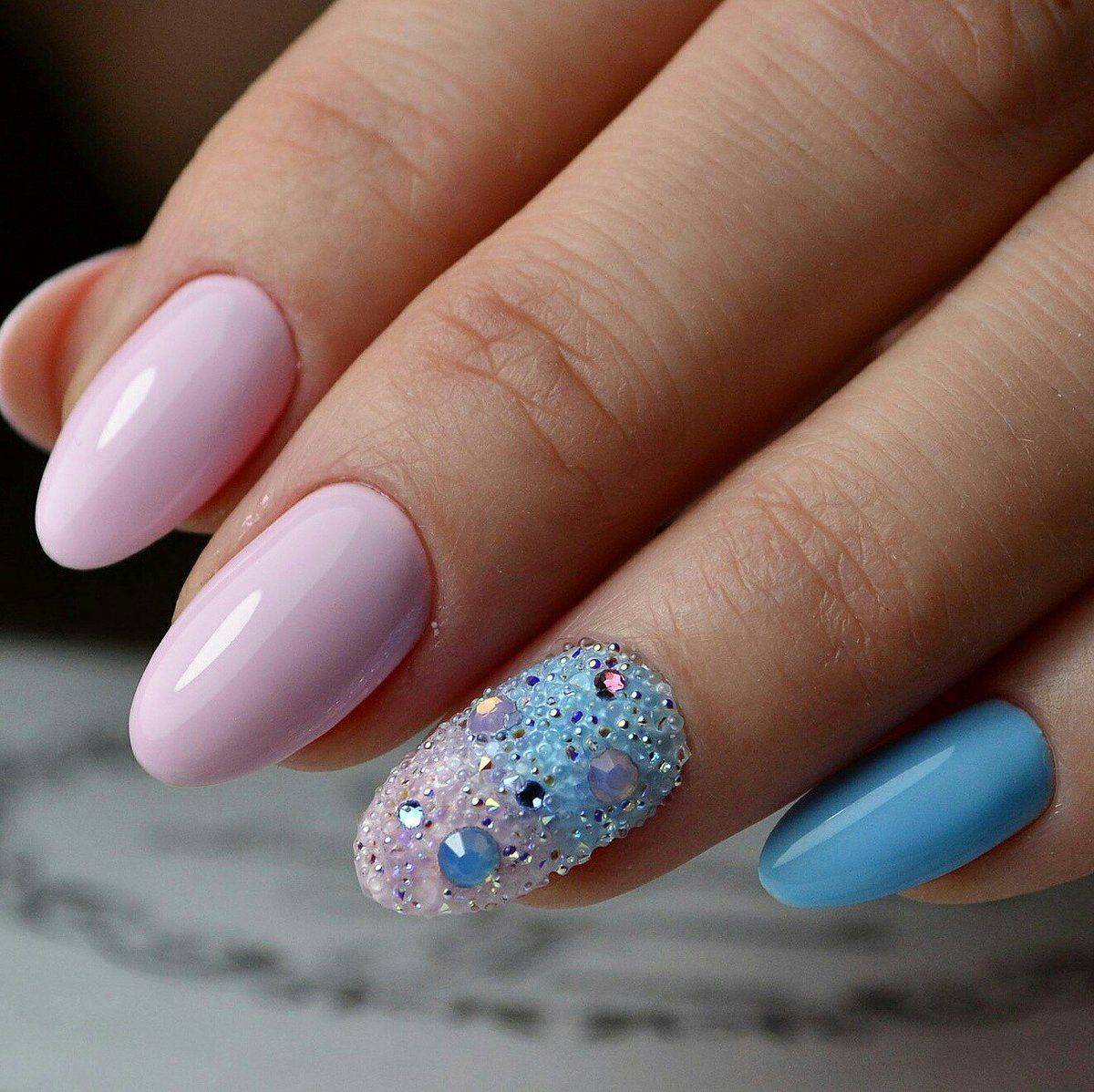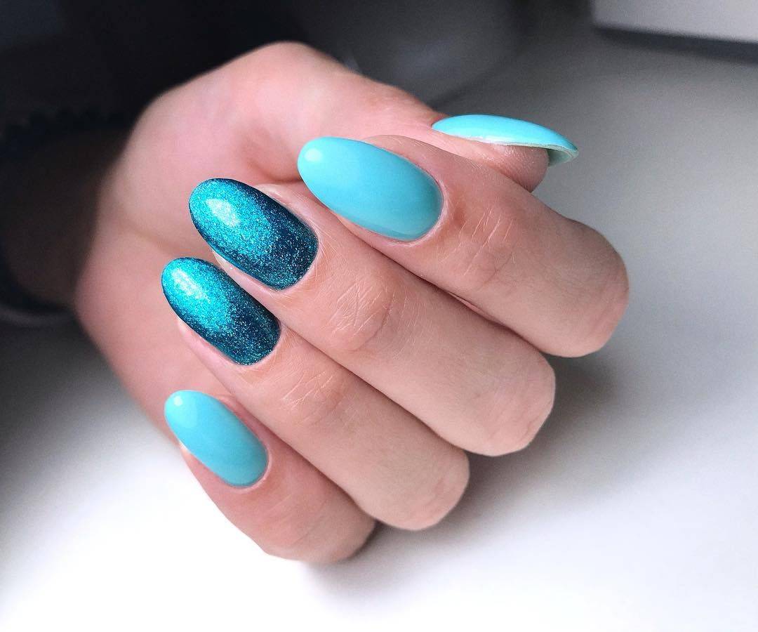 Овальный маникюр с присыпкой будет хорошо сочетаться с любым цветом, поскольку это декорирование. Однако не стоит «засыпать» все ногти, расставляйте акценты.