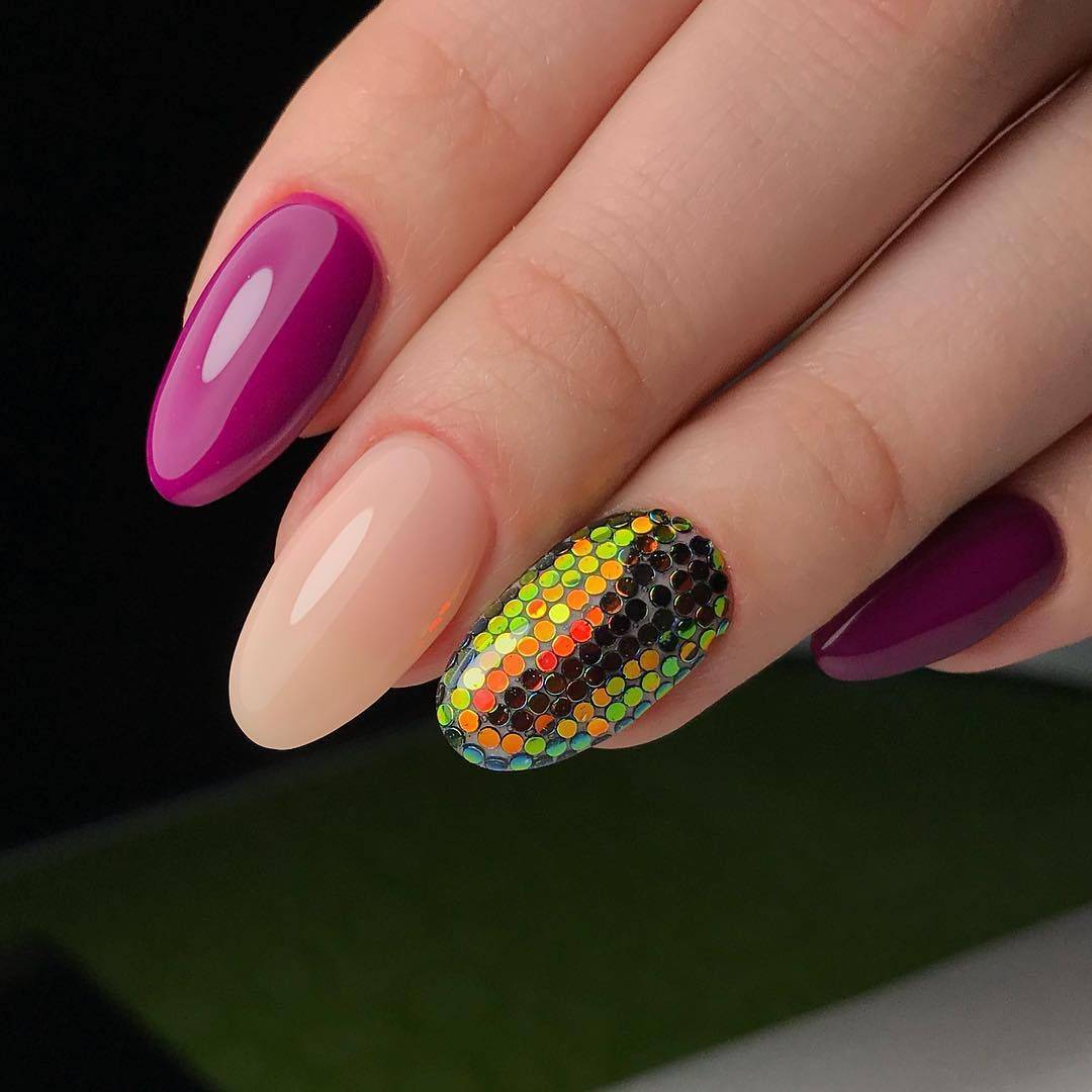 Светоотражающий, как и неоновые оттенки, уходит в прошлое. В овальном маникюре больше внимания уделяется пастельным тонам. Светоотражающий маникюр подойдет для мероприятия, и то, лучше всего им акцентировать.