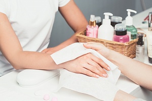 - Перед началом процедуры руки (ноги) обрабатываются дезинфицирующим средством. При выполнении процедуры после маникюра, ее следует начинать по окончанию работы с кутикулой и перед массажем.
