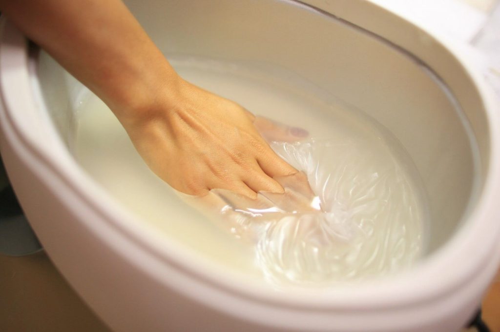 - В ёмкость с жидким парафином поместите руки и оставьте на пару секунд, потом поднимите. Парафин начнет постепенно остывать и на ладонях образуется тонкая полупрозрачная пленка.