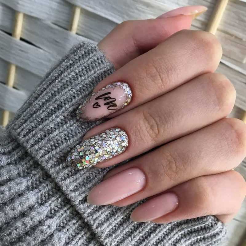Сплошной нюд можно разбавить блестками и тонкой полоской цветного лака.