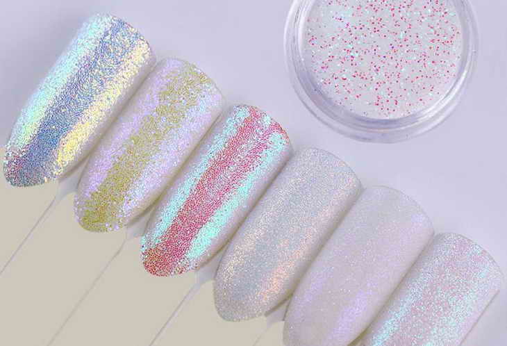 Для создания сияющего глянца применяют мелкодисперсный порошок, называемый втиркой. В основном она имеет металлический отблеск, дающий эффект зеркальных переливов. Но также имеются золотые, жемчужные, голографические втирки.