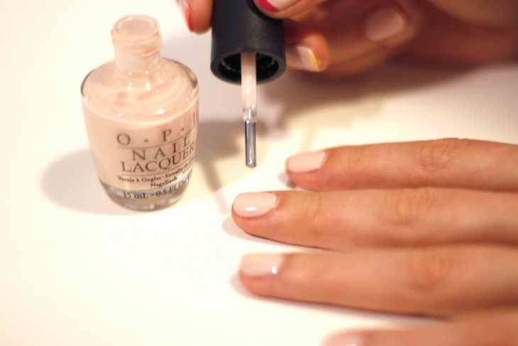 - Расположите на ногтях лак основного цвета. Также требует просушивания и предполагает создание равномерных слоев.