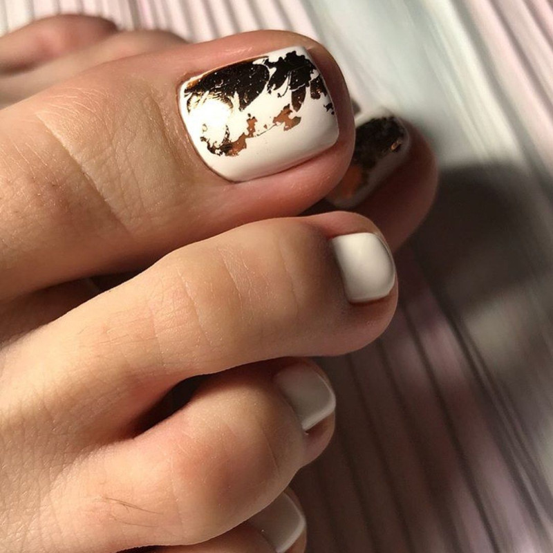 Можно использовать только большой палец для декора, однако минимальный дизайн на остальных пальцах только дополнит конечный вариант педикюра.