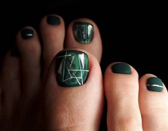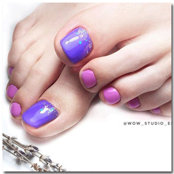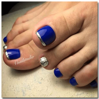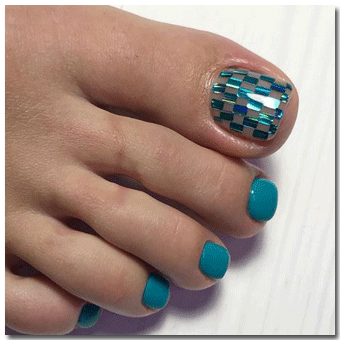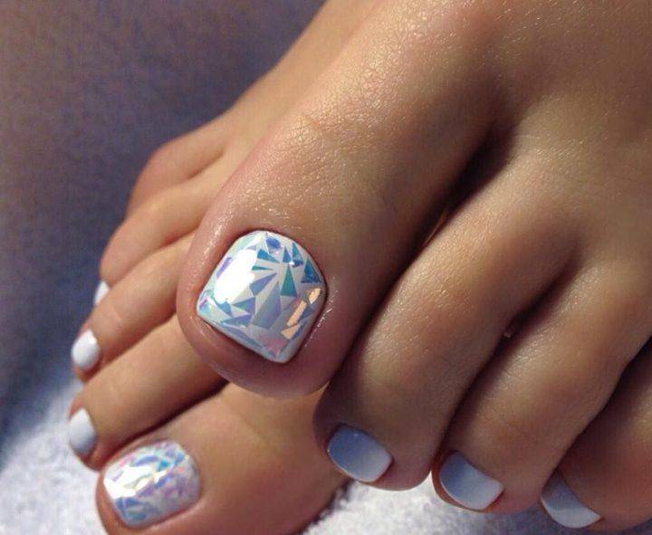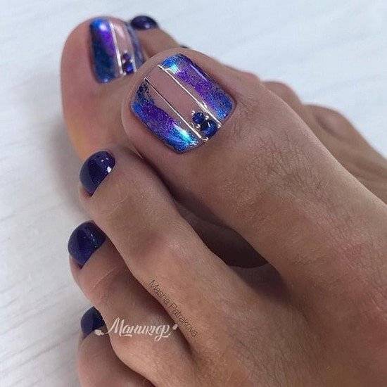 Достаточно редкий вид педикюра с использованием голографической втирки. Такая втирка прекрасно смотрится на любой длине ногтей, что позволяет создать красивый и необычный педикюр.