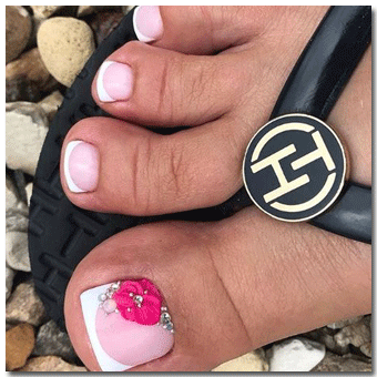 Дизайн педикюра может быть столь же универсален, как и маникюр. Вот почему классический френч на ногах используется так же часто как и французский маникюр. Более того, здесь нет строгих рамок и вы можете привнести любую комбинацию цветов, украсить стразами, блестками.