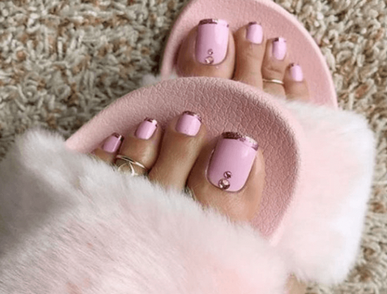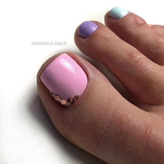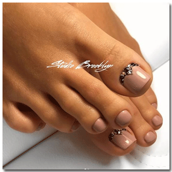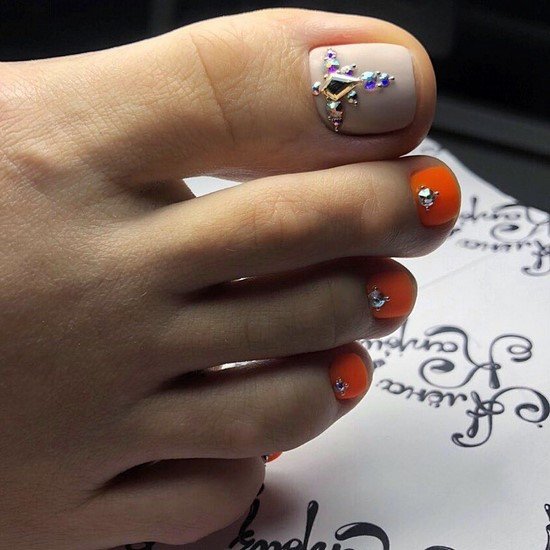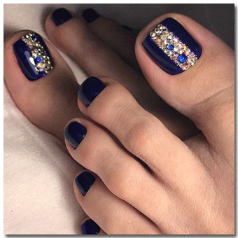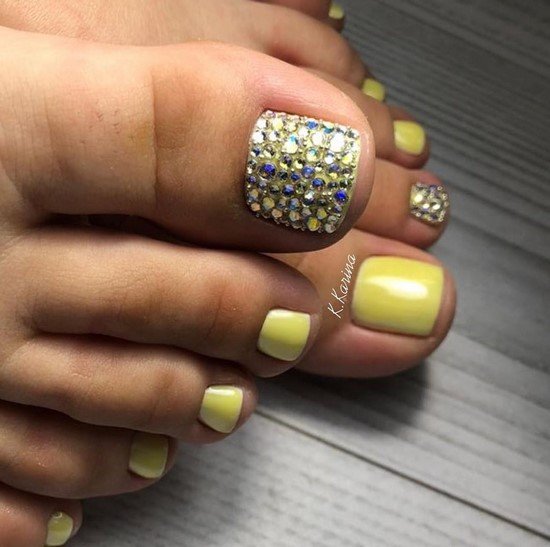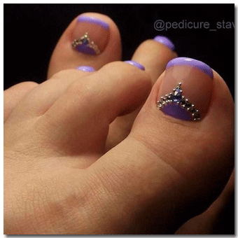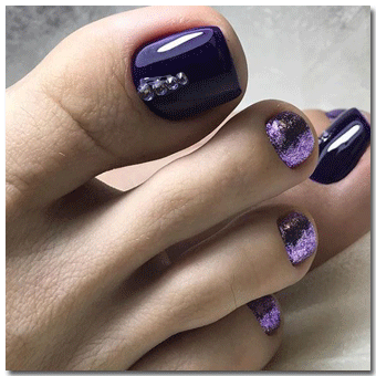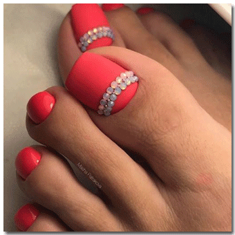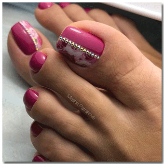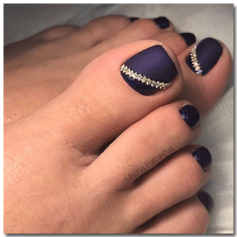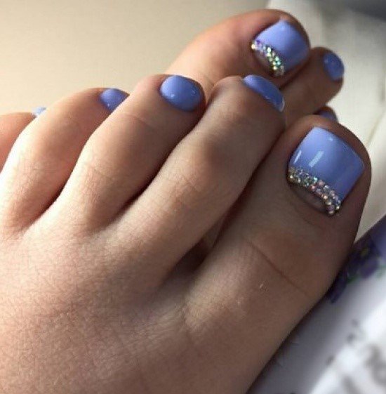 - использование стразов – камни, блестки, глиттер и другой переливающийся декор, несомненно, уместен в педикюре, но в незначительном количестве. Используйте миниатюрные стразы в прикорневой зоне и глиттер с краю ноготка. Такой дизайн будет выглядеть менее плоско, получит дополнительный акцент и яркие нотки.