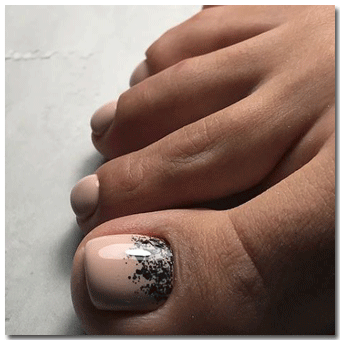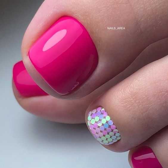 Самый модный педикюр 2020 года — с пайетками (большими блестками). Их переливы напоминают дискотечный шар в клубах. Данный дизайн сразу покорил всех модниц маникюра, и конечно же, добрался до педикюра. Чаще пайетки выкладываются на большом пальце, причем их количество варьируется, как и форма, и объем (могут быть плоскими или 3d) Это настоящий хит лета, который сочетается с любыми цветами и является одной из модных идей сезона.