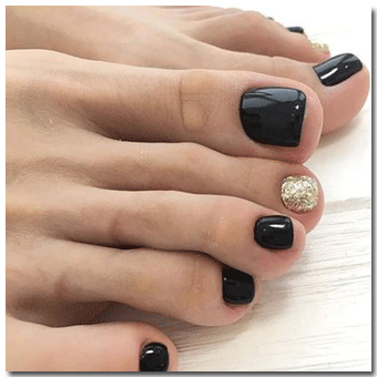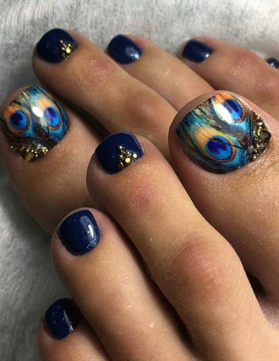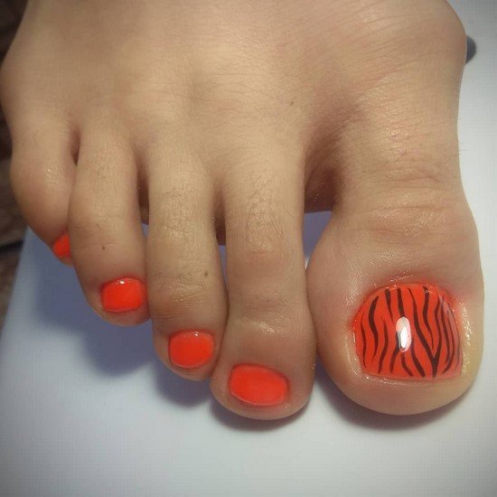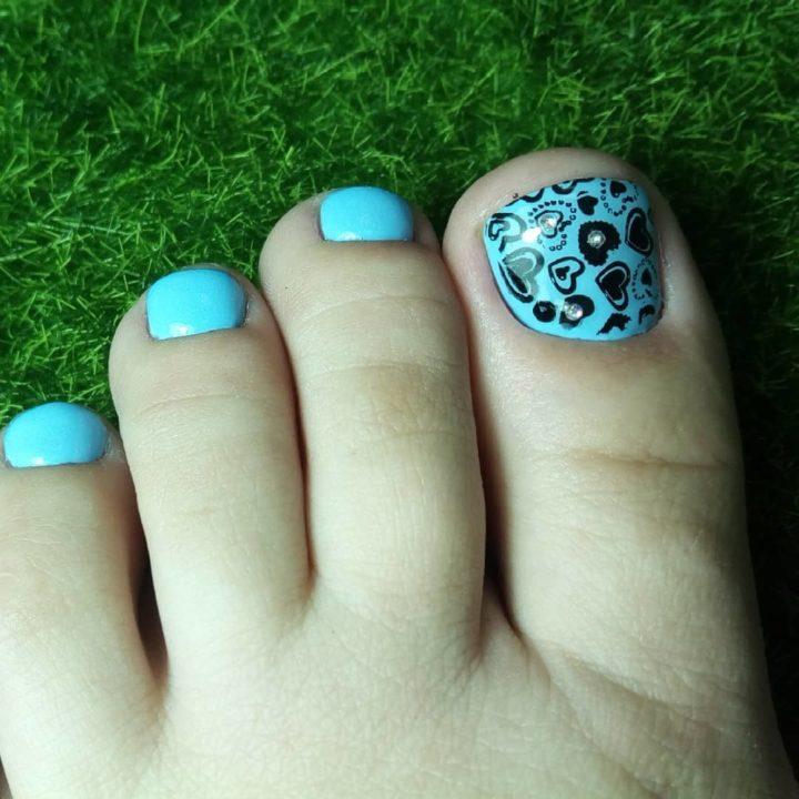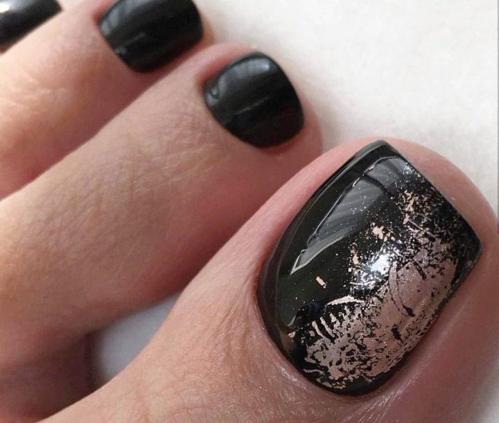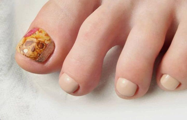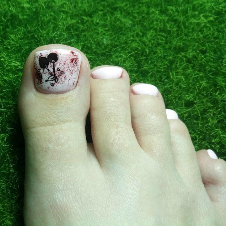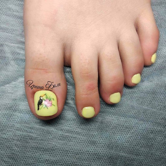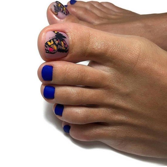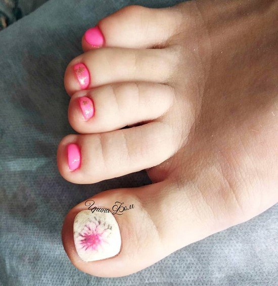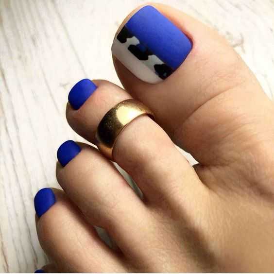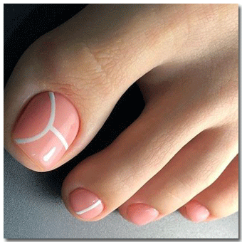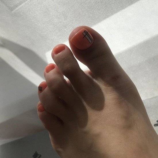 Можно использовать только большой палец для декора, однако минимальный дизайн на остальных пальцах только дополнит конечный вариант педикюра.