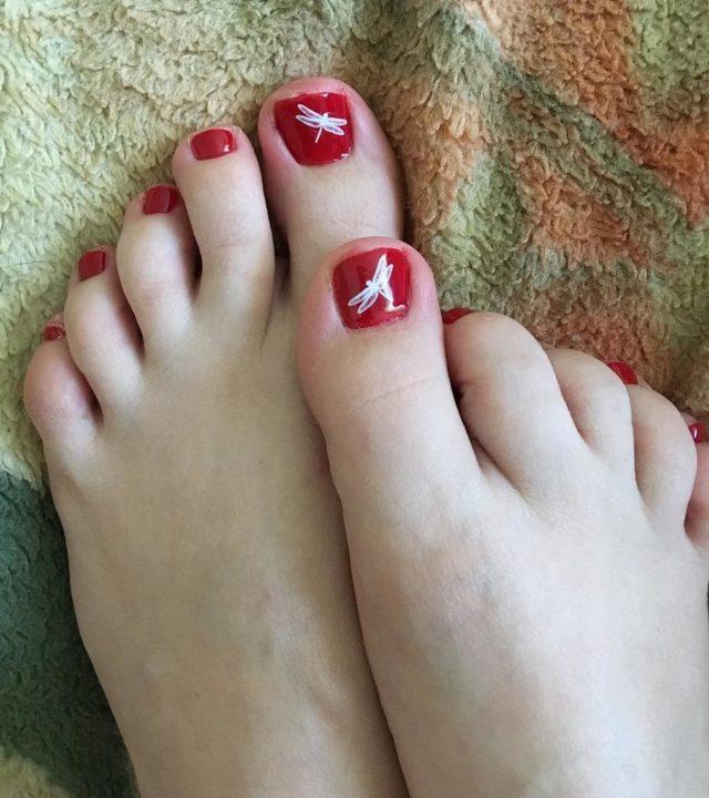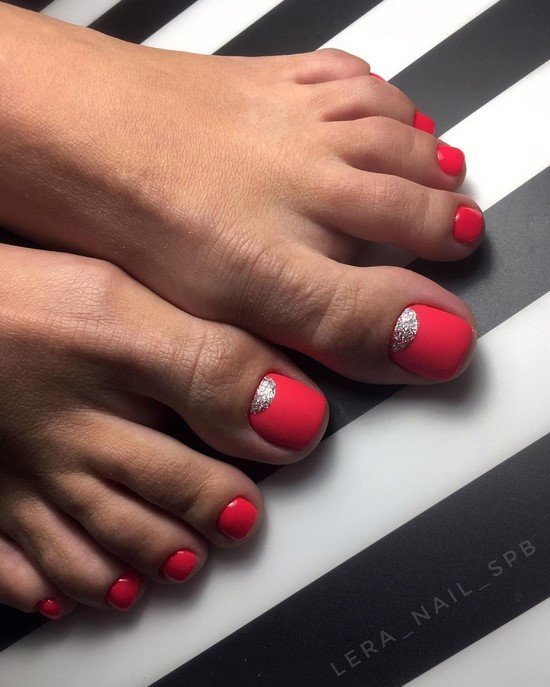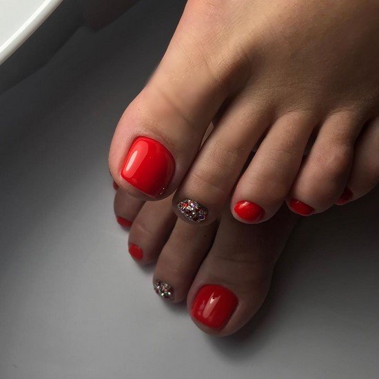 Классический красный — как же это сексуально и стильно выглядит на пальчиках ног! Красный педикюр — это внутренняя уверенность в себе, повышение самооценки. Красный лак можно использовать не только в однотонном варианте, но и сделать необычную яркую линию «улыбки» на прозрачной основе, нарисовать цветы, горох, полоски. Все это разнообразит и подчеркнет страстность натуры.