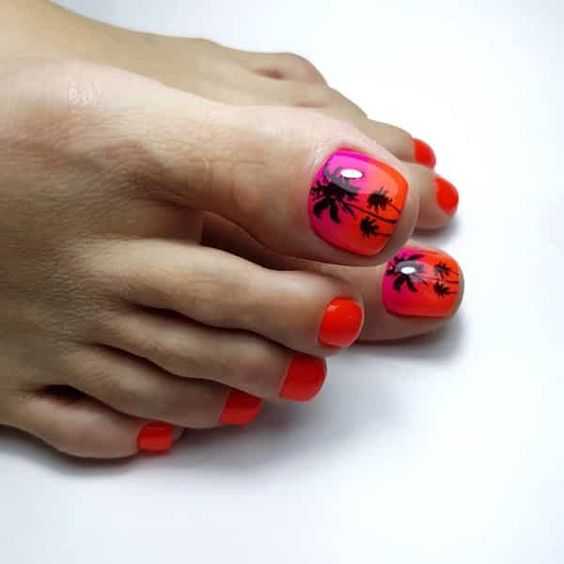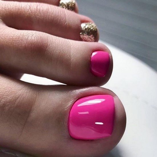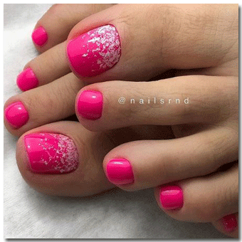 Смелые неоновые тона неожиданно ворвались в мир нейл-арта и даже успели завоевать сердца модниц. Также пользуется большой популярностью эффектная фуксия, которая хороша как в глянцевом, так и в матовом исполнении. А если хочется сделать более яркий акцент в педикюре, сочетайте неоновые тона в технике градиент.
