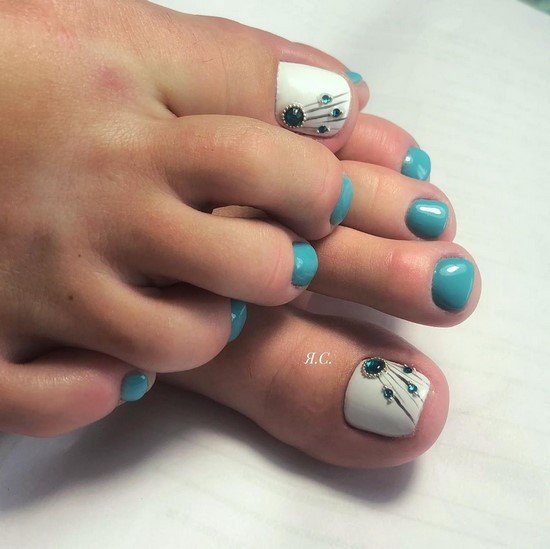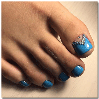 Стразы, как уже говорилось, играют на свету, дают красивые блики и делают педикюр «нарядным». Оформить камнями можно каждый палец, или сделать акценты – любой из вариантов уместен для морского педикюра.