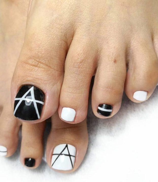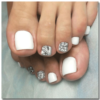 Черно-белый педикюр с нежным геометрическим орнаментом тоже будет среди трендов в этом году. Как и в прошлые сезоны, актуален гибридный вариант. Любителям интенсивного блеска рекомендуется педикюр в пастельных тонах с добавлением золота и серебра.