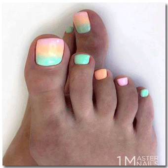 Сделайте матовый и глянцевый летний педикюр в разноцветных вариациях, задействовав технику градиентного нейл-арта, комбинируя самые неожиданные палитры тонов.