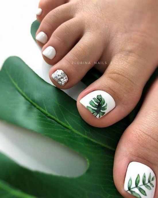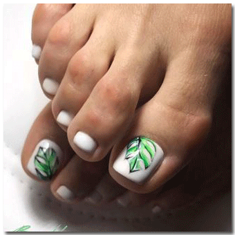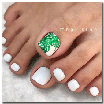 Самые модные в этом году листья пальм и монстеры, насыщенно зеленого цвета, которые гармонично смотрятся на белом гель-лаке. Педикюр с цветами может выполняться различными техниками: графической и художественной росписью; использование наклеек-слайдеров не менее интересно. Для экстравагантных дам — лепка 3D отличное решение.