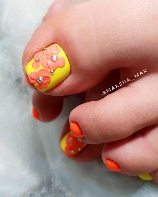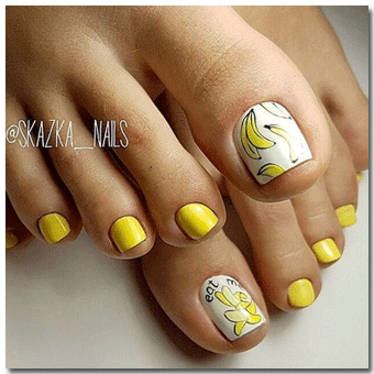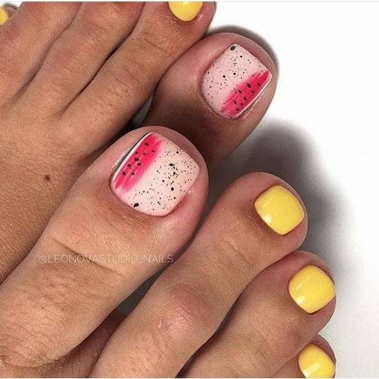 Актуальная тема для лета — создание «сочного» педикюра. Общую картину эффектно дополнят яркие летние цвета желтого, розового, красного, лимонного оттенка. А при правильном комбинировании цветов такой летний дизайн не будет иметь даже намека на вульгарность.