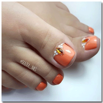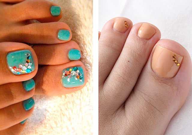 Искрящиеся стразы внесут шик в педикюр. Крошечные кристаллы, переливающиеся всеми гранями на солнце — один из лучших декоров для ног. Нежное мерцание очень деликатно и органично смотрится в летнем педикюре. Инкрустация может быть довольно разнообразная, что делает этот вариант весьма универсальным. Но помните, что данный декор лучше всего «носится» с открытой обувью, так как в тесных закрытых туфлях, стразы могут отвалиться.