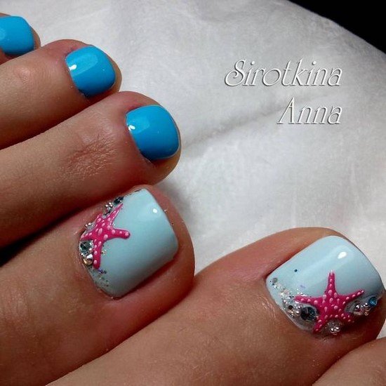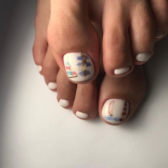 А также не стоит забывать об оригинальном оформлении педикюра в морском стиле, с помощью сине-белых полосок, якорей, морских обитателей (рыбок, ракушек, морских звезд). Яркое решение будет очень уместно именно на отдыхе.