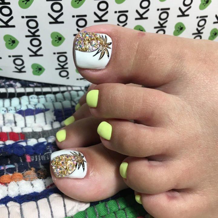 Ну и куда без популярного сейчас фрагментного оформления – выбери нужные ноготки и их части и плотно покрой блестками. Так ты получишь красивый педикюр на лето.