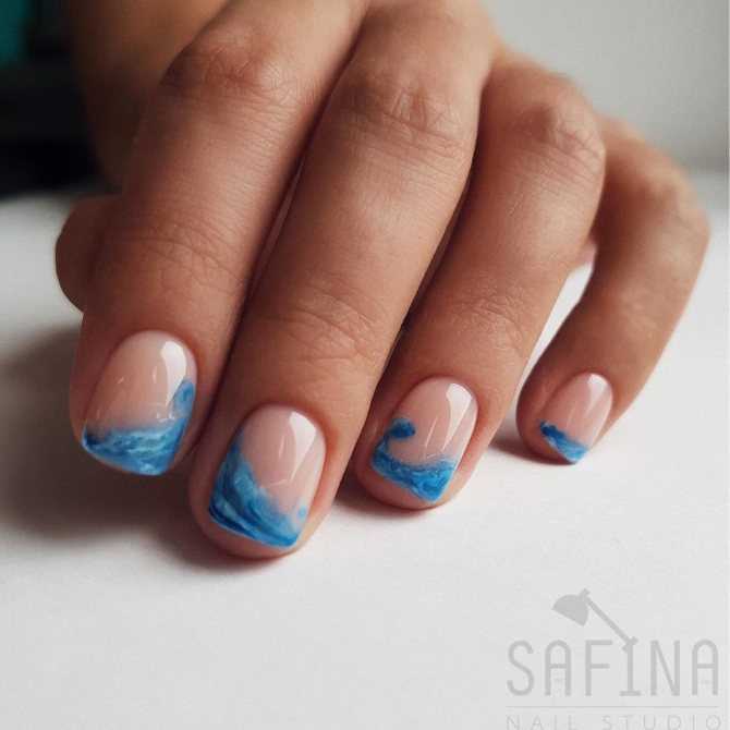 Нарисовать морскую волну на ногтях очень легко. Используйте для этого маникюрные кисти, желательно широкие. Что касается материала, то можно смешать голубой, белый, серебряный оттенки на палетке и этой массой нарисовать абстрактный узор. Если в вашем распоряжении есть акварельные краски, то можно использовать их. Узор, выполненный акварелью, получится гораздо мягче и плавнее.