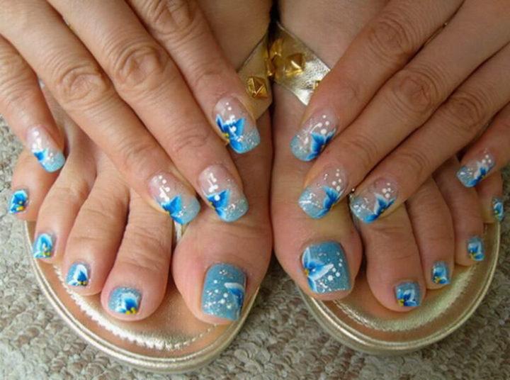 Морской дизайн ногтей чаще всего выполняется в голубоватых, синих и белых тонах. Оформления можно не жалеть – морской педикюр допускает наличие сразу нескольких видов декоративных элементов – страз, наклеек, рисунков.