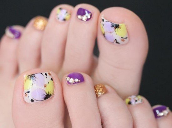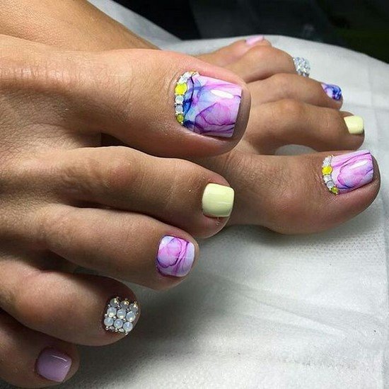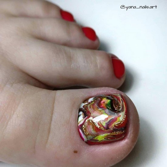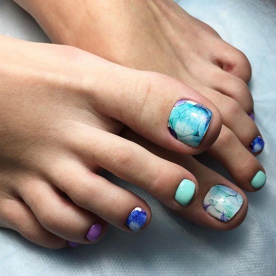 Неожиданные росписи педикюра, исполненном на мокром геле, что выполнены как в монотонном решении, так и в сочетании красок