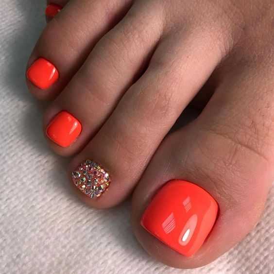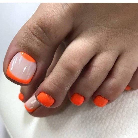 Энергичный оранжевый лак излучает позитив, поэтому оранжевый дизайн не может быть скучноватым и унылым даже в монохроме. Летний оранжевый педикюр — это разнообразие и многовариантность дизайна. Попробуйте, например, соединить оранжевый с желтым в технике градиент. Такой вариант просто создан для отдыха на море.