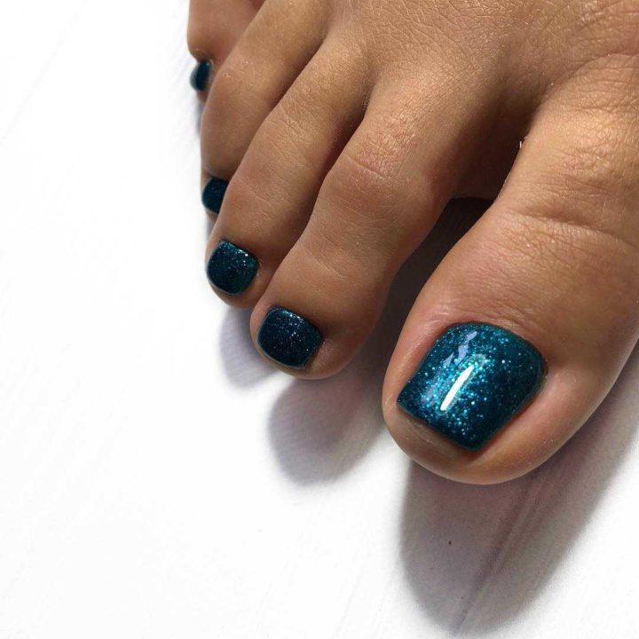 Самый простой способ сделать летний педикюр с блестками – выбрать гель-лак, уже включающий мерцающие частицы. Делается легко, а выглядит оригинально.