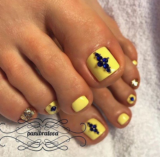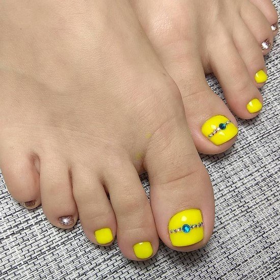 Одним из самых популярных летних оттенков уже не первый год остается желтый. Не обязательно делать монохром, яркий желтый можно использовать в качестве базы и украсить его декором или комбинировать с другими оттенками. Отлично смотрится желтый дизайн педикюра с блестками и фольгой.