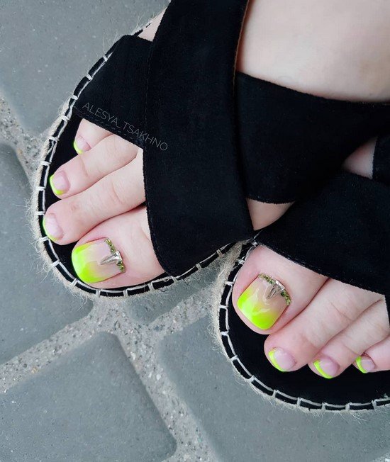 Первый летний педикюр, на который советуем обратить внимание в периоды зноя и жары, неоновый педикюр лето. Неон уверенно внедрился во все направления моды, включая обувь, одежду и, конечно же, приемы, что делают вашу внешность совершеннее