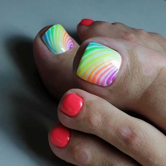 Привлеките внимание с ярким неоновым педикюром. Используйте яркие и яркие цвета для создания эффекта ночного свечения и станьте центром внимания на вечеринке