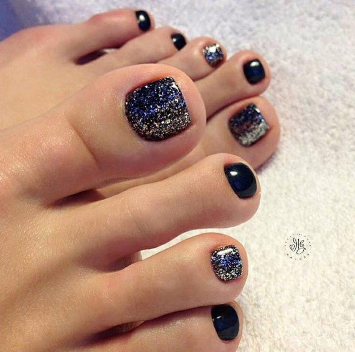 Прекрасная идея для Нового Года использовать блестящий педикюр. С блестящими гелями и лаком очень легко сделать прекрасный педикюр, особо не тратясь на дорогостоящие декоры или сложные рисунки.