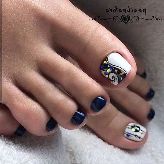 Морской педикюр в стиле минимализм состоит из двух тонов: светлого и темного колора. Для этого не надо окрашивать поочередно ногти, достаточно одну часть выполнить белым цветом, другую нарисовать темным.